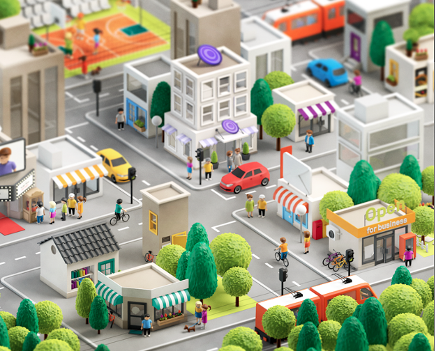 A 3D city model showing the use of maths concepts such as shapes, measurement, area, patterns, and numbers in real-life city planning.