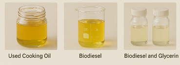 This project outlines the transesterification process, where used cooking oil reacts with alcohol and a catalyst to produce biodiesel. The biodiesel is then separated from glycerin, showing a real-world example of renewable fuel production and sustainable energy solutions.